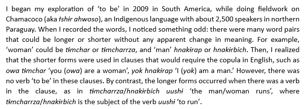Indeed, in many languages, such as Chamacoco and Hungarian, a copula is not (or not always) used. Although “non-verbal predication” may sound like an opaque label for laypeople, we all use non-verbal predication many times every single day.