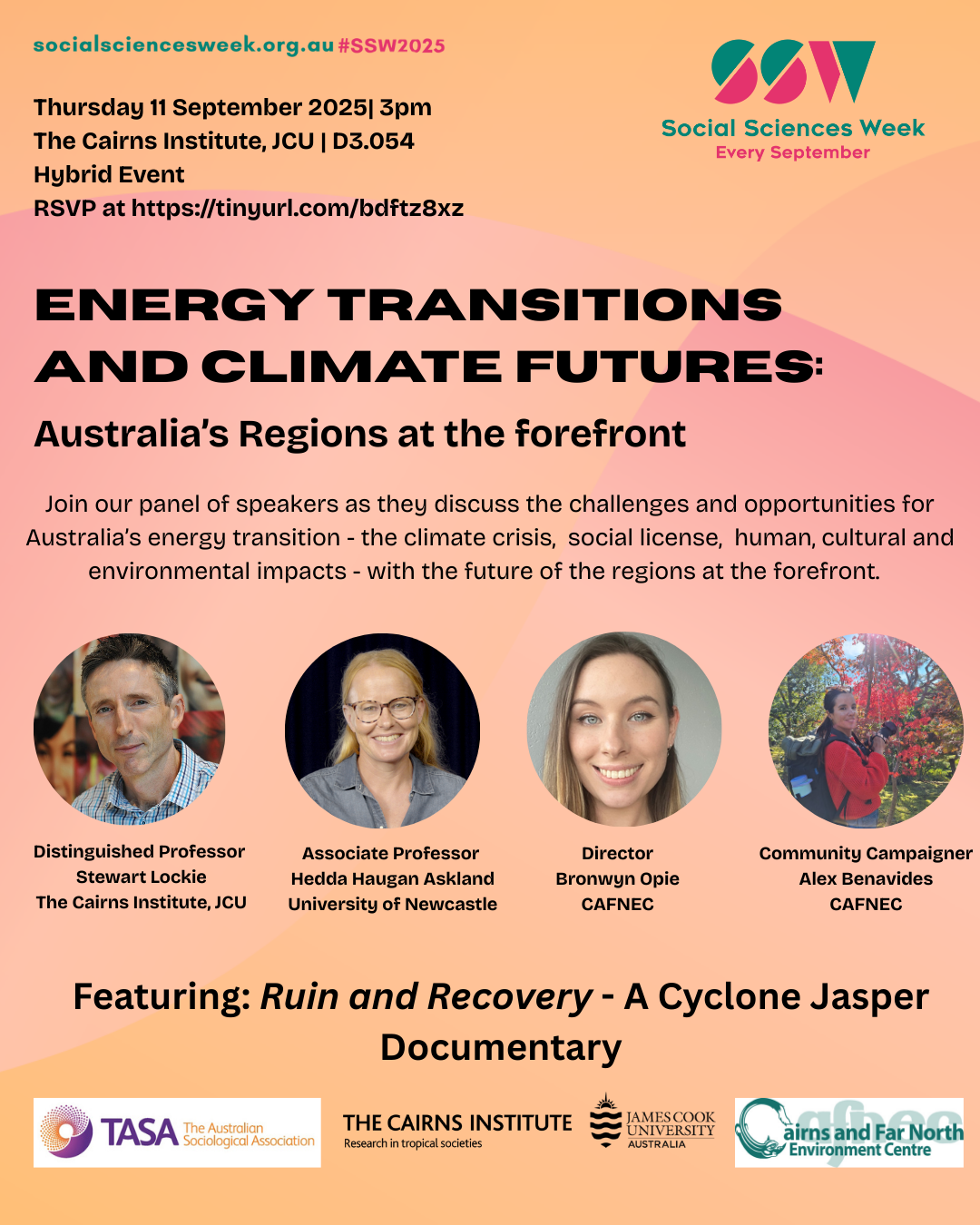 The Australian Sociological Association (TASA) in collaboration with The Cairns Institute (TCI) presents the Energy Transitions and Climate Futures: Australia’s regions at the forefront. This symposium brings together diverse voices – to discuss climate change, energy, economic, and social policy and advocacy and how the regions are playing a key role in change.