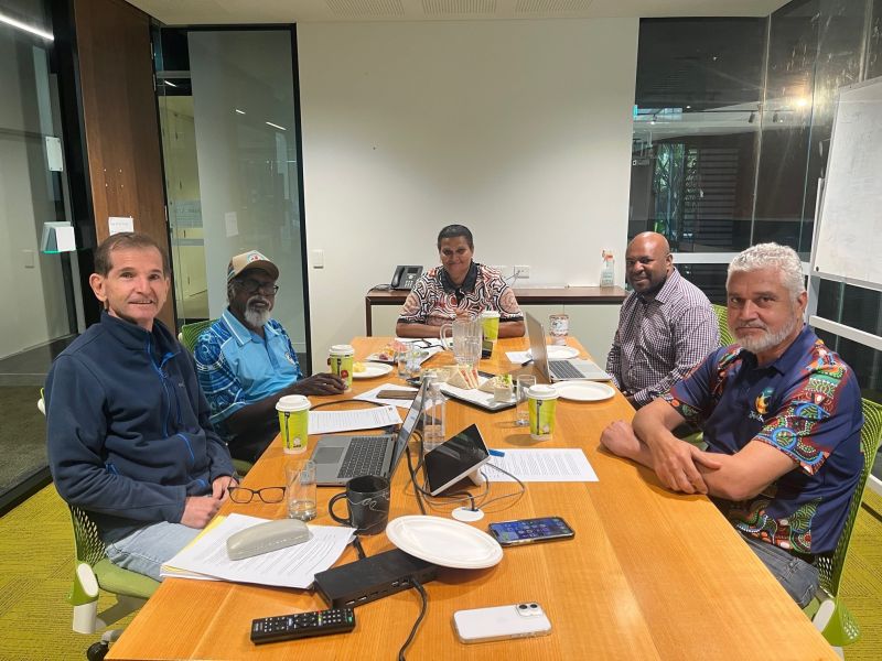 Image: First Nations Reference group meeting for Cape York Water Project. (l-r) Dr Jim Turnour, Johnson Chippendale, Fanny Solomon, Dr Abner Yalu and Conrad Yeatman.